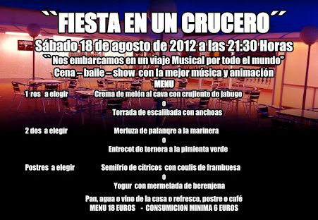 SABADO 18 DE AGOSTO DE 2012 A LAS 21:30 HORAS TRANSFORMAREMOS EL RESTAURANTE "LA CAFETERIA" EN BARCO PARA EMBARCARNOS EN UNA AVENTURA MUSICAL Y DE DIVERSION EN NUESTRA : "FIESTA EN UN CRUCERO" HAS TU RESERVA, TE ESPERAMOS... SERA INOLVIDABLE !!!